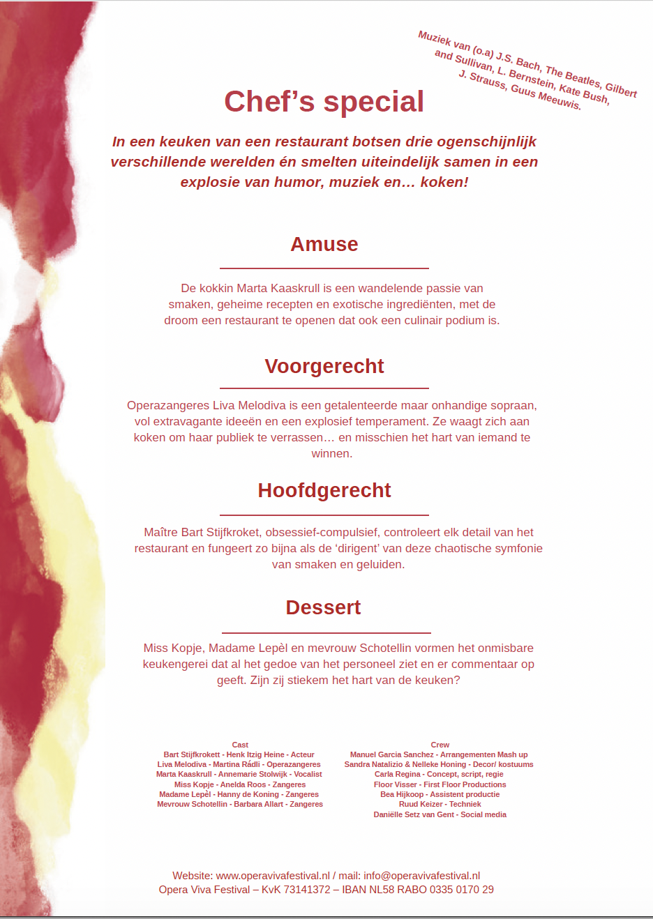 Tussen hoge noten en culinaire ambities verzint de operazangeres bizarre gerechten en zingt aria’s terwijl ze met de ene hand ingrediënten roert en met de andere wild gebaart, wat tot hilarische en onverwachte situaties leidt. Haar excentriciteit veroorzaken chaos in de keuken en wanhoop bij de kok en maître.